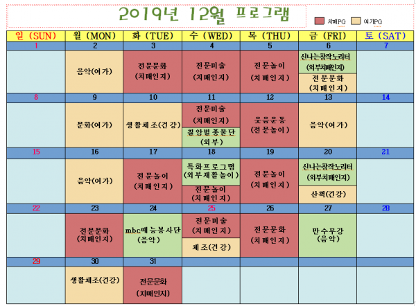 * 2019년 12월 프로그램일정 페이지 정보 작성자 웹마스터 댓글 0건 조회 2,897회 작성일 19-11-22 12:15 목록 본문 □ 우리 진주요양원에서 진행되는 2019년12월 프로그램 일정을 소개하겠습니다. 추천62